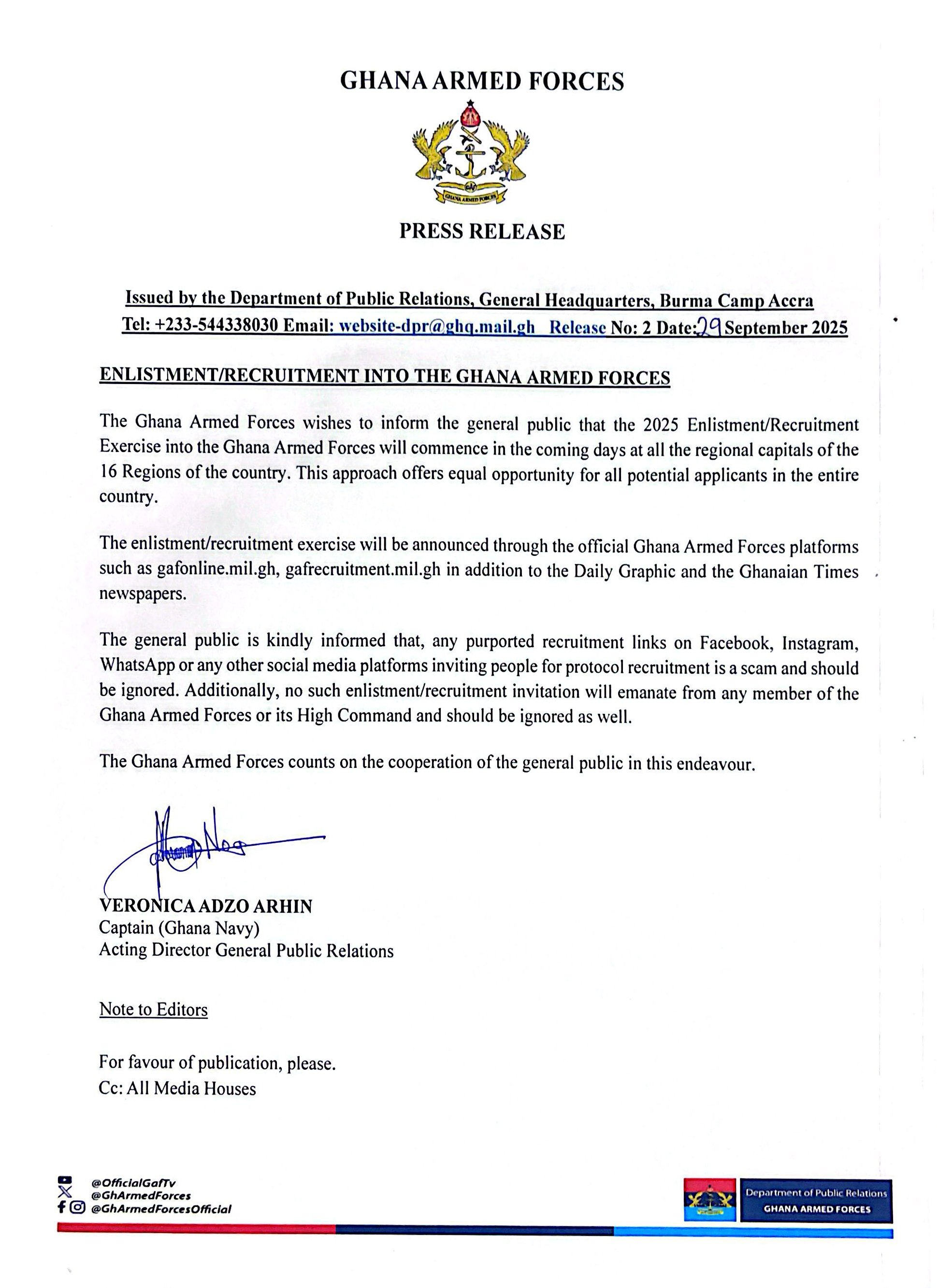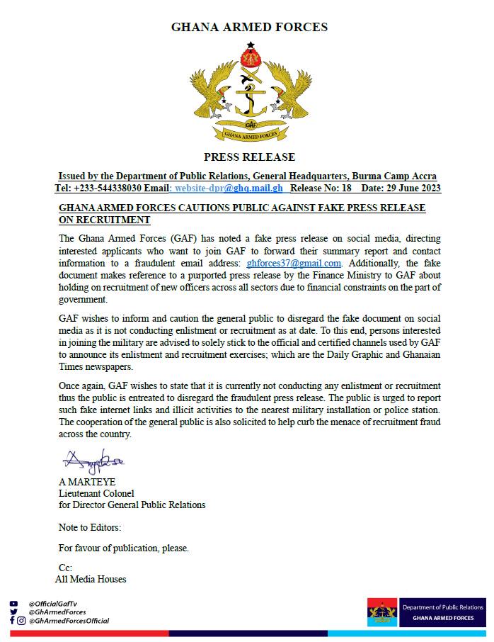 GHANA ARMED FORCES CAUTIONS PUBLIC AGAINST FAKE PRESS RELEASE ON RECRUITMENT